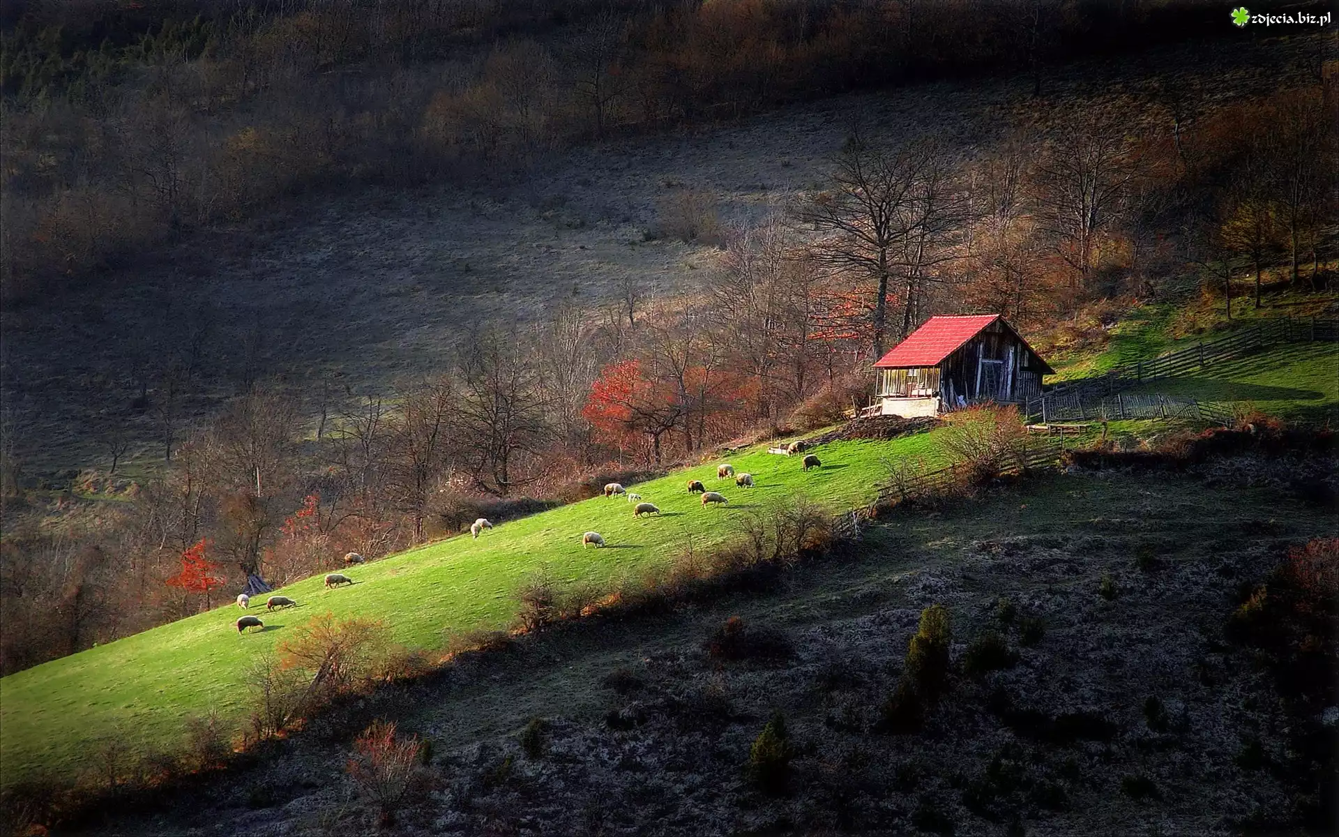 Zdjęcie, Łąka, Drzewa, Domek, Owce, Farmy i pola