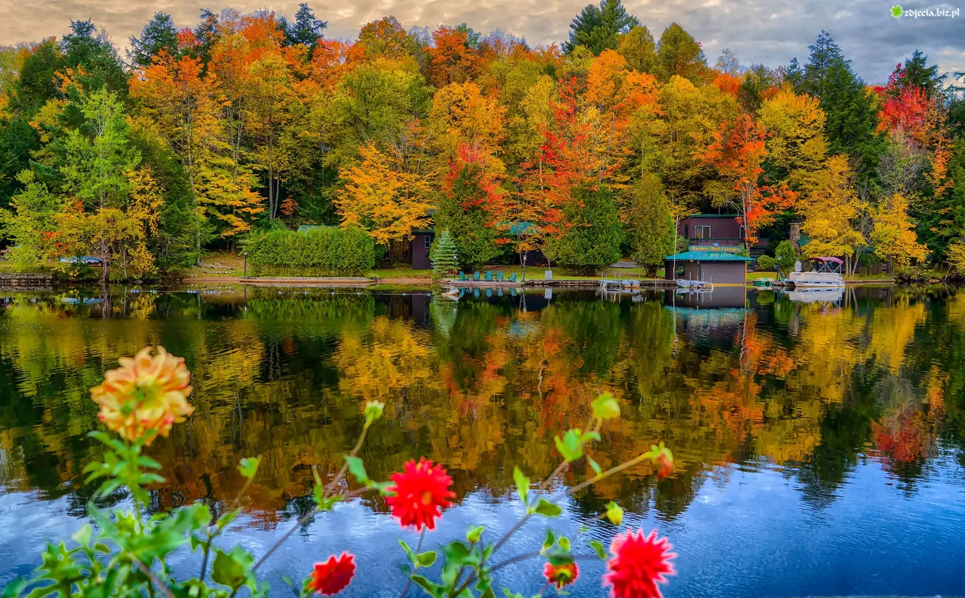 Zdjęcie Domek, Park, Jezioro, Kwiaty, Jesień