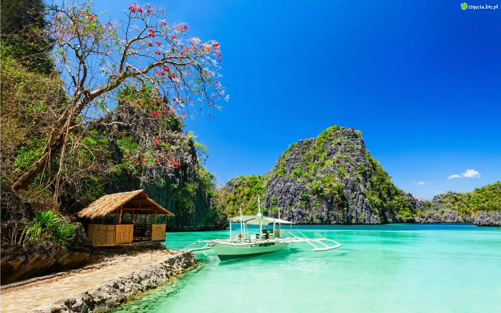 Zdjęcie Łódka, Morze, Skały, Domek, Tropiki