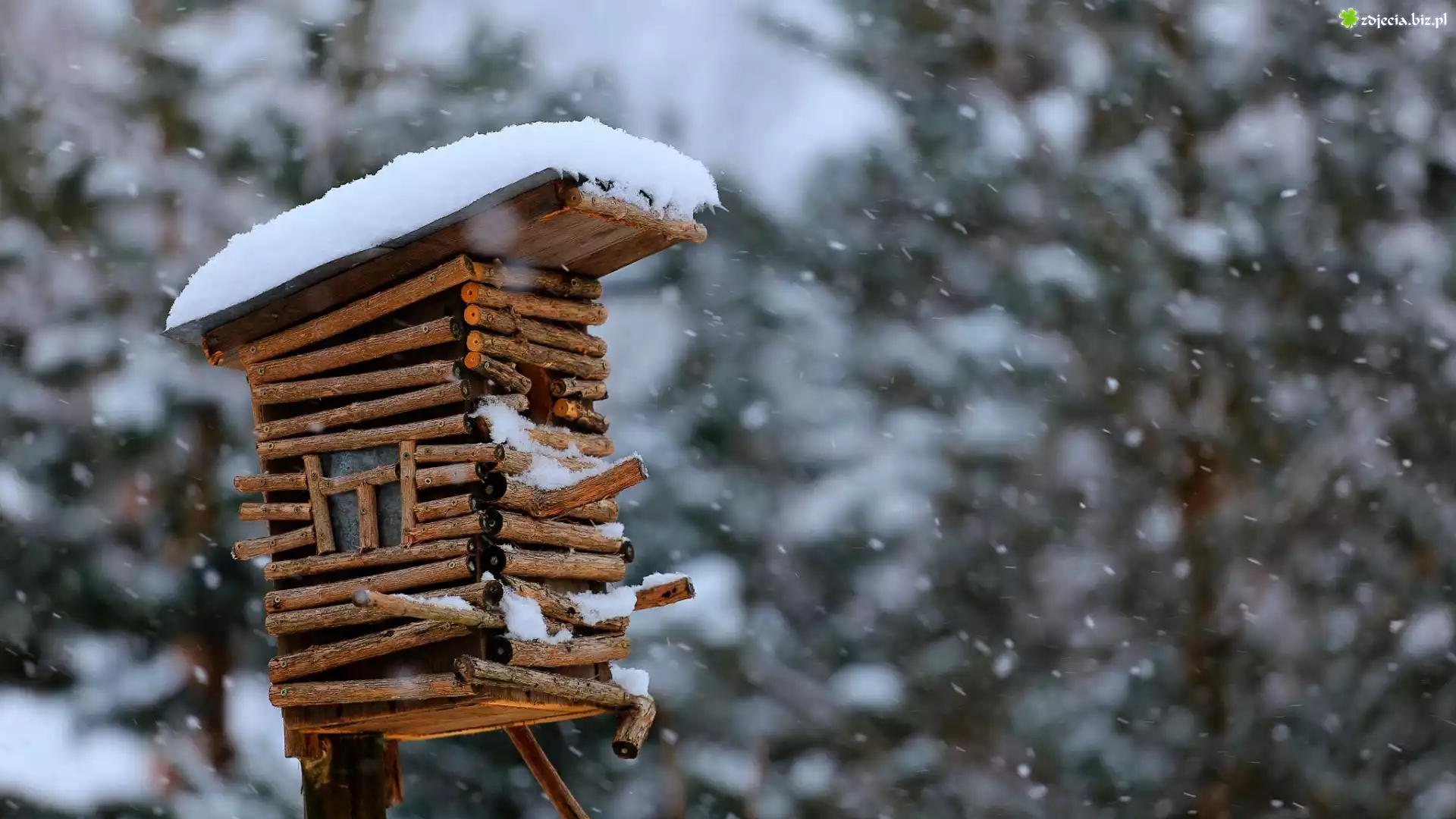 Zdjęcie Zima, Śnieg, Drewniany, Domek dla ptaków