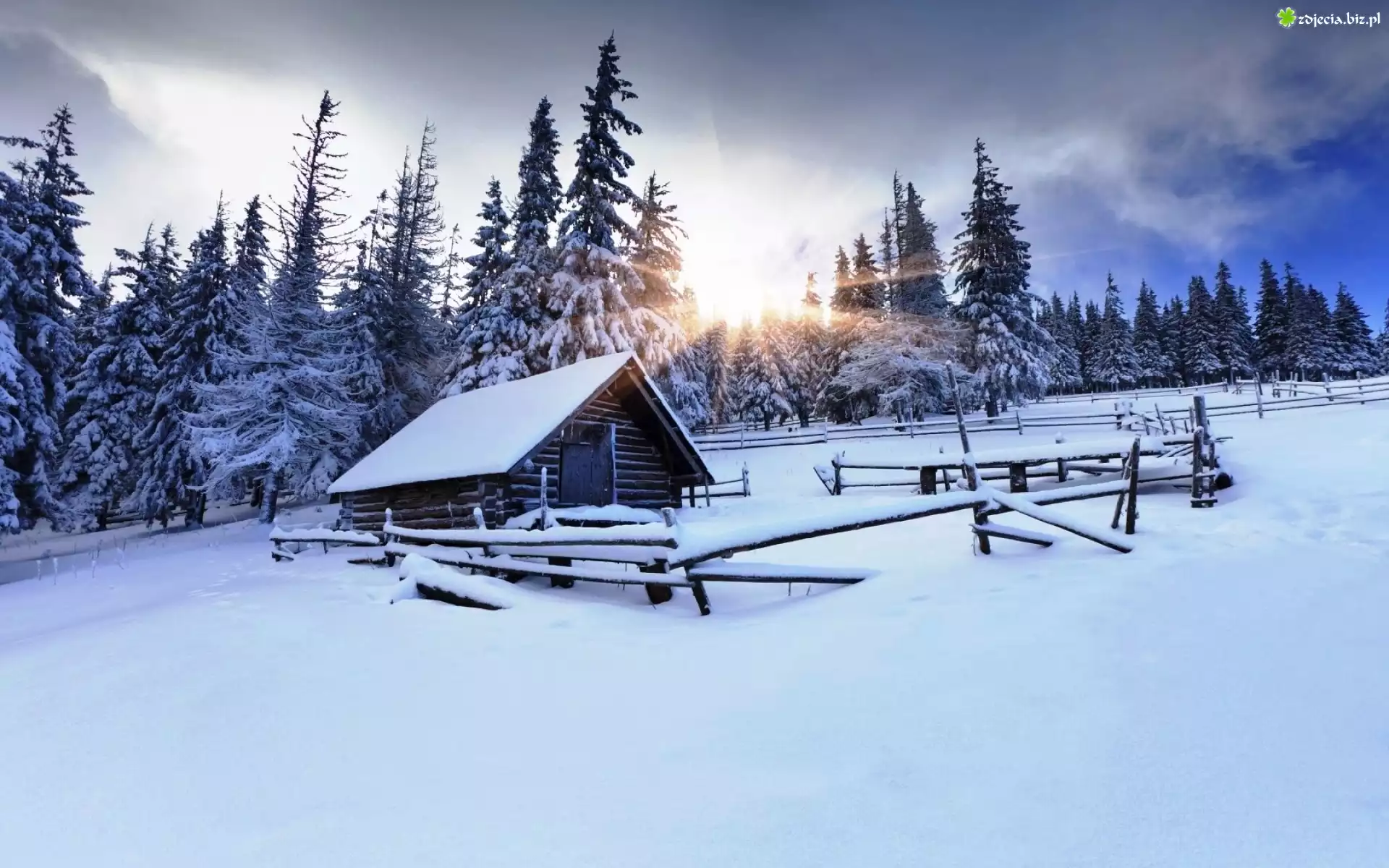 Zdjęcie Domek, Las, Promienie Słońca, Zima
