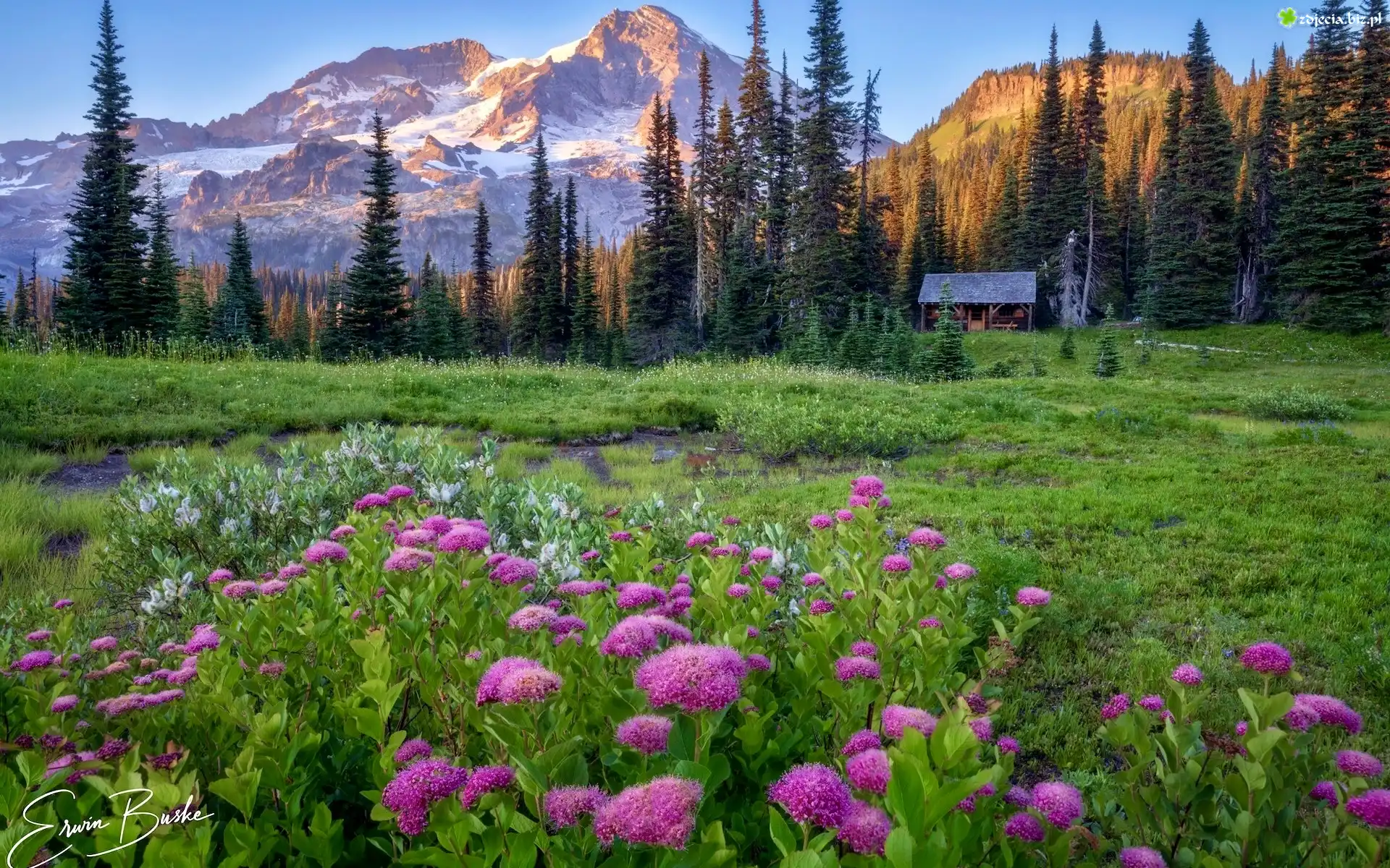 Zdjęcie Stany Zjednoczone, Waszyngton, Park Narodowy Mount Rainier, Góry, Łąka, Domek, Drzewa, Kwiaty |