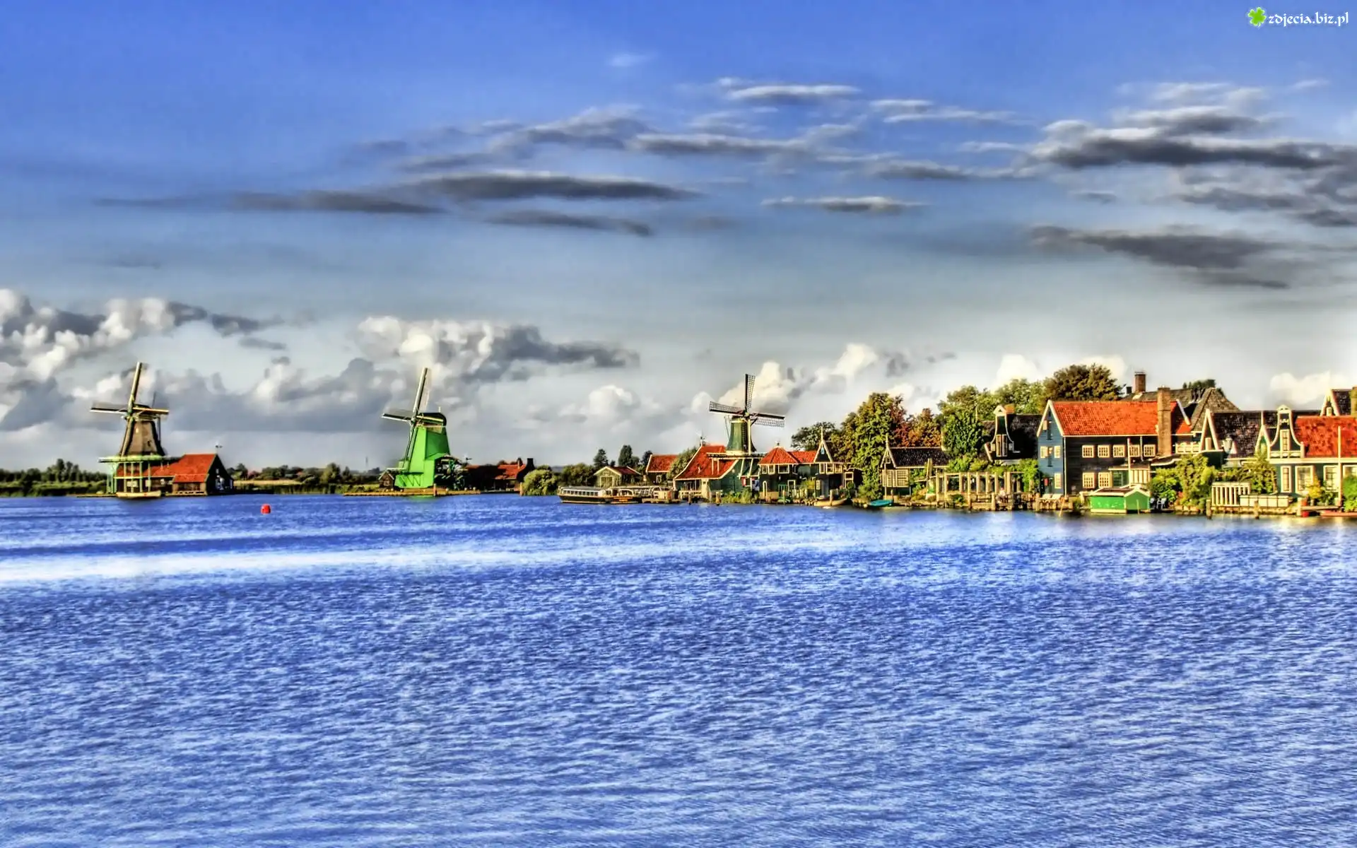 Zdjęcie, Wiatraki, Domki, Wybrzeże
