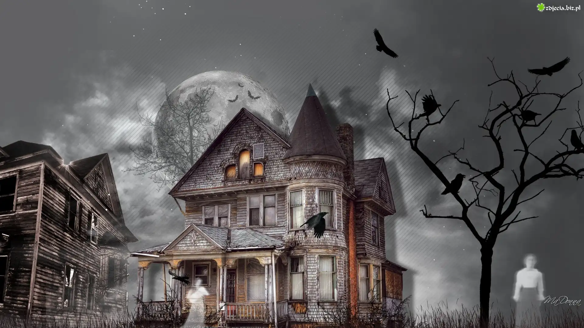 Zdjęcie Domy, Drzewo, Ptaki, Duchy, Noc