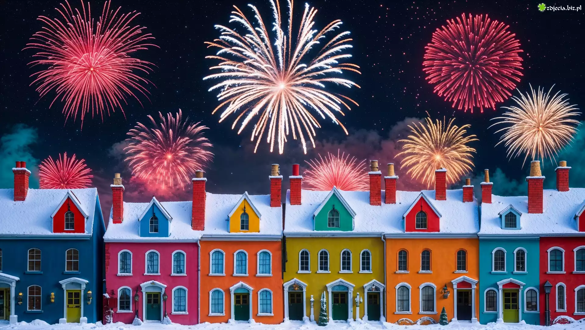 Zdjęcie Kolorowe, Domy, Fajerwerki, Sylwester, Grafika