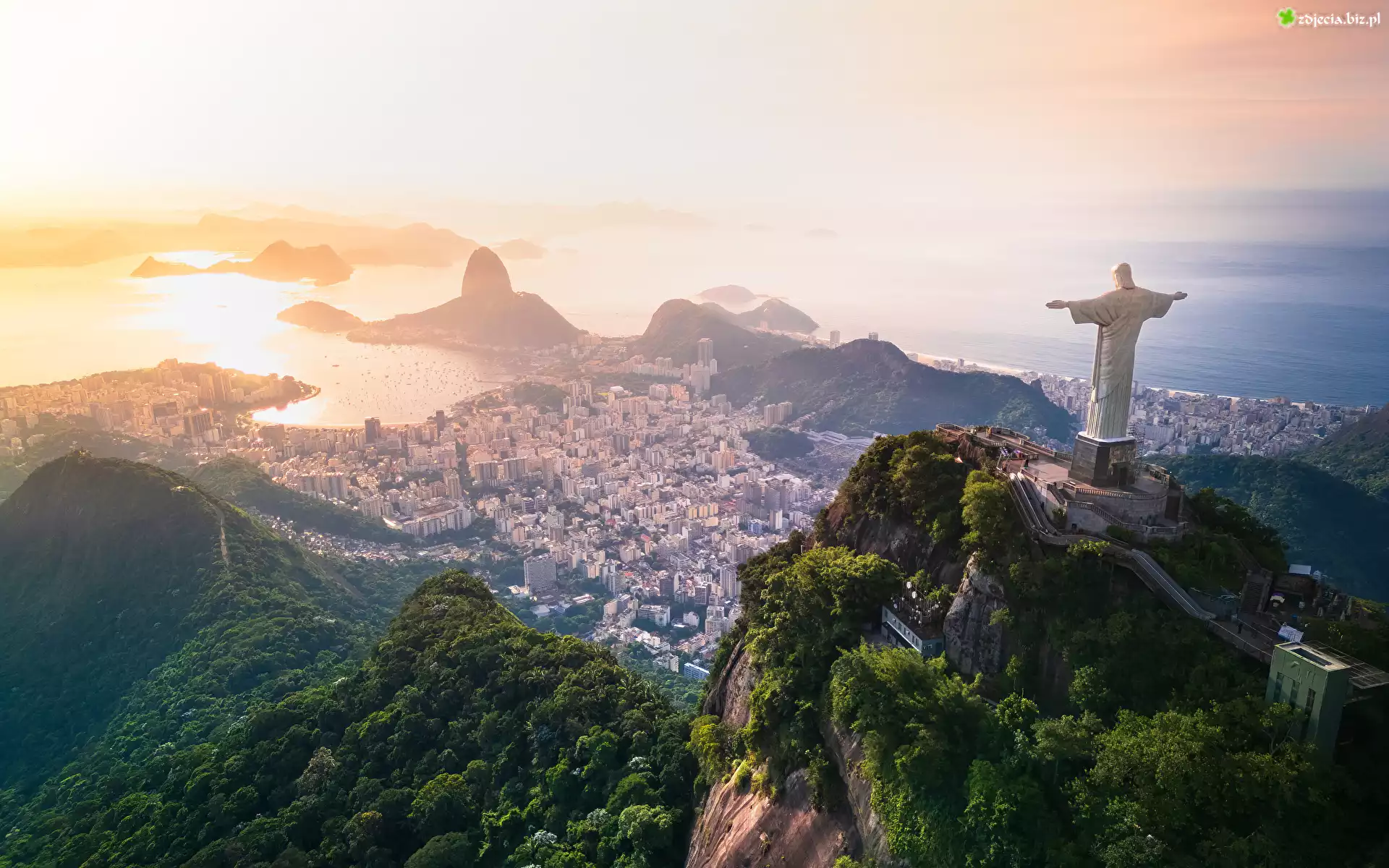 Zdjęcie Brazylia, Rio de Janeiro, Ocean, Mgła, Domy, Góry, Statua Chrystusa Zbawiciela