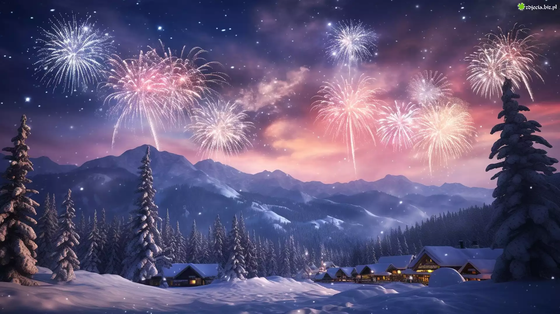 Zdjęcie Grafika, Sylwester, Góry, Zima, Drzewa, Choinki, Fajerwerki, Domy