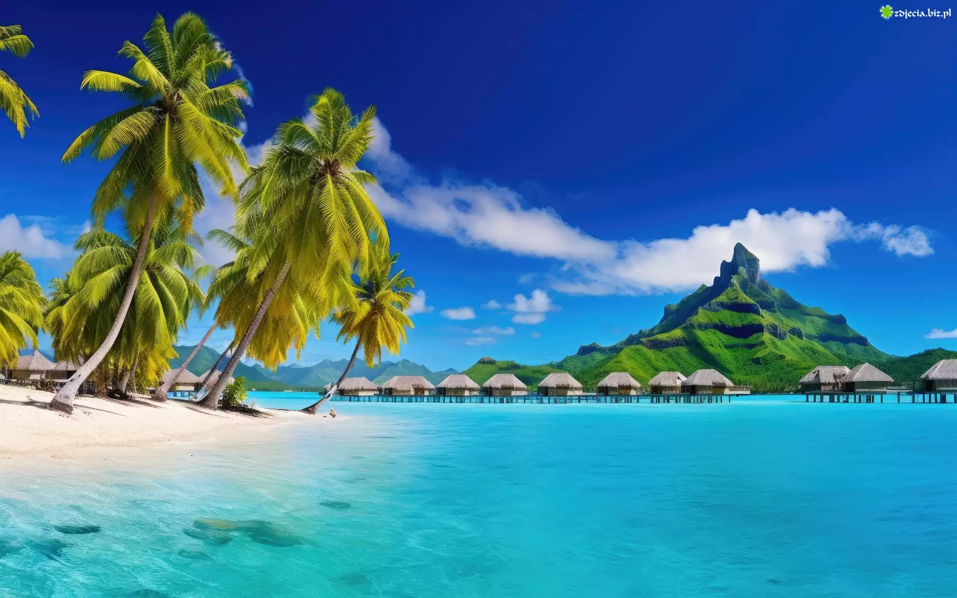 Zdjęcie Morze, Plaża, Palmy, Domy, Góra, Grafika