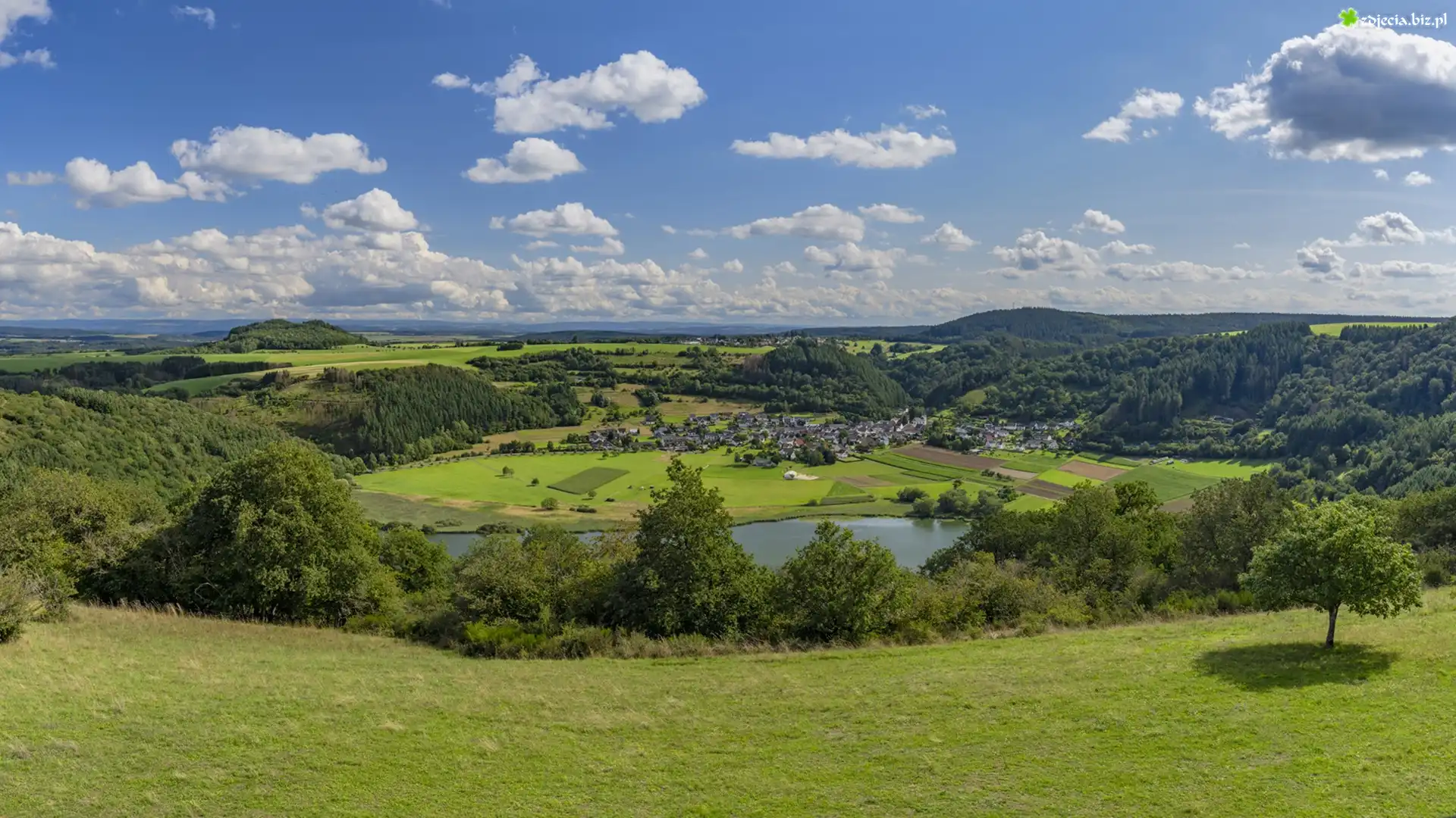 Zdjęcie Wzgórza, Pole, Miasteczko, Domy, Drzewa, Jezioro