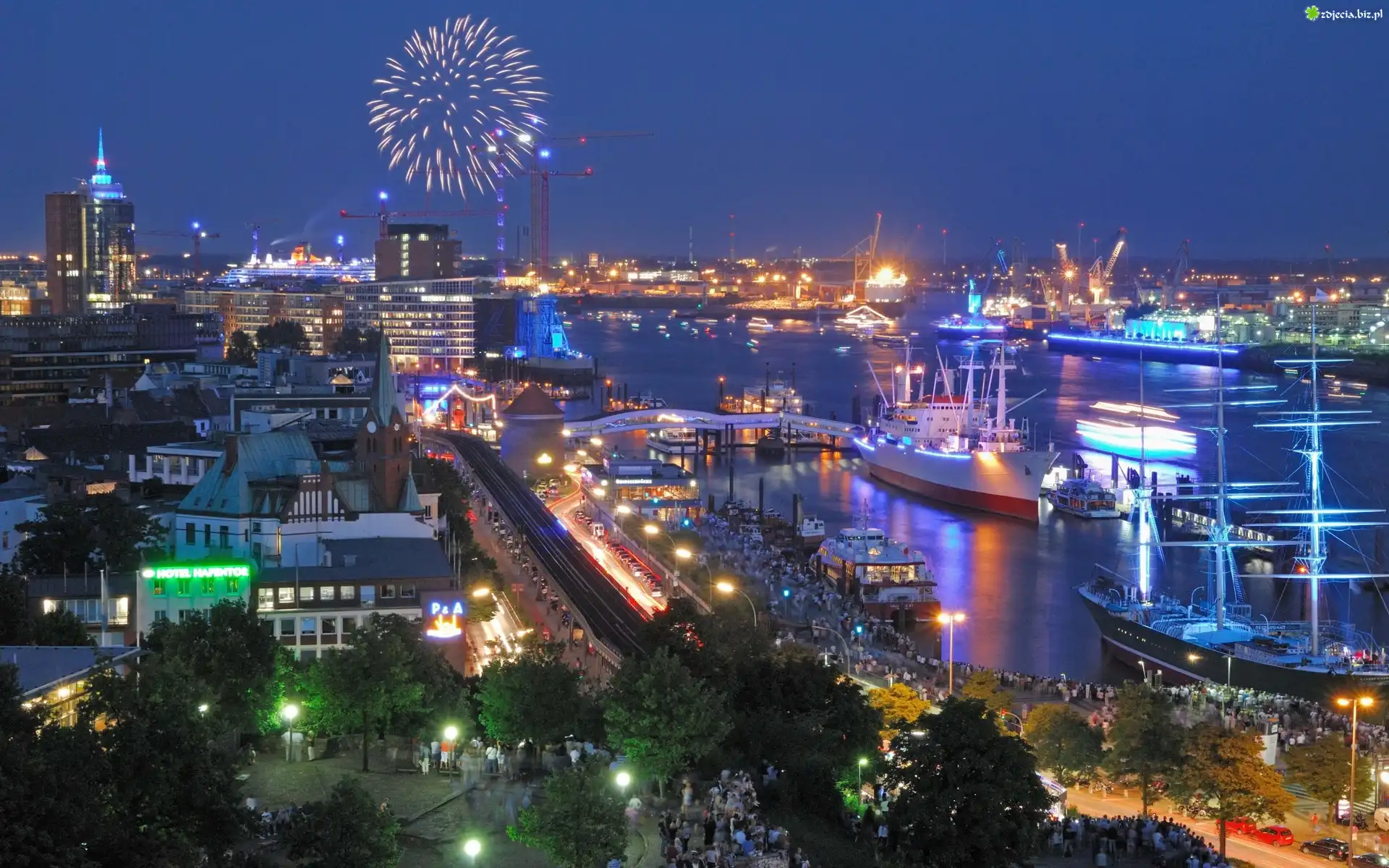 Zdjęcie Wieżowce, Domy, Port, Statki, Fajerwerki, Hamburg, Panorama, Miasta