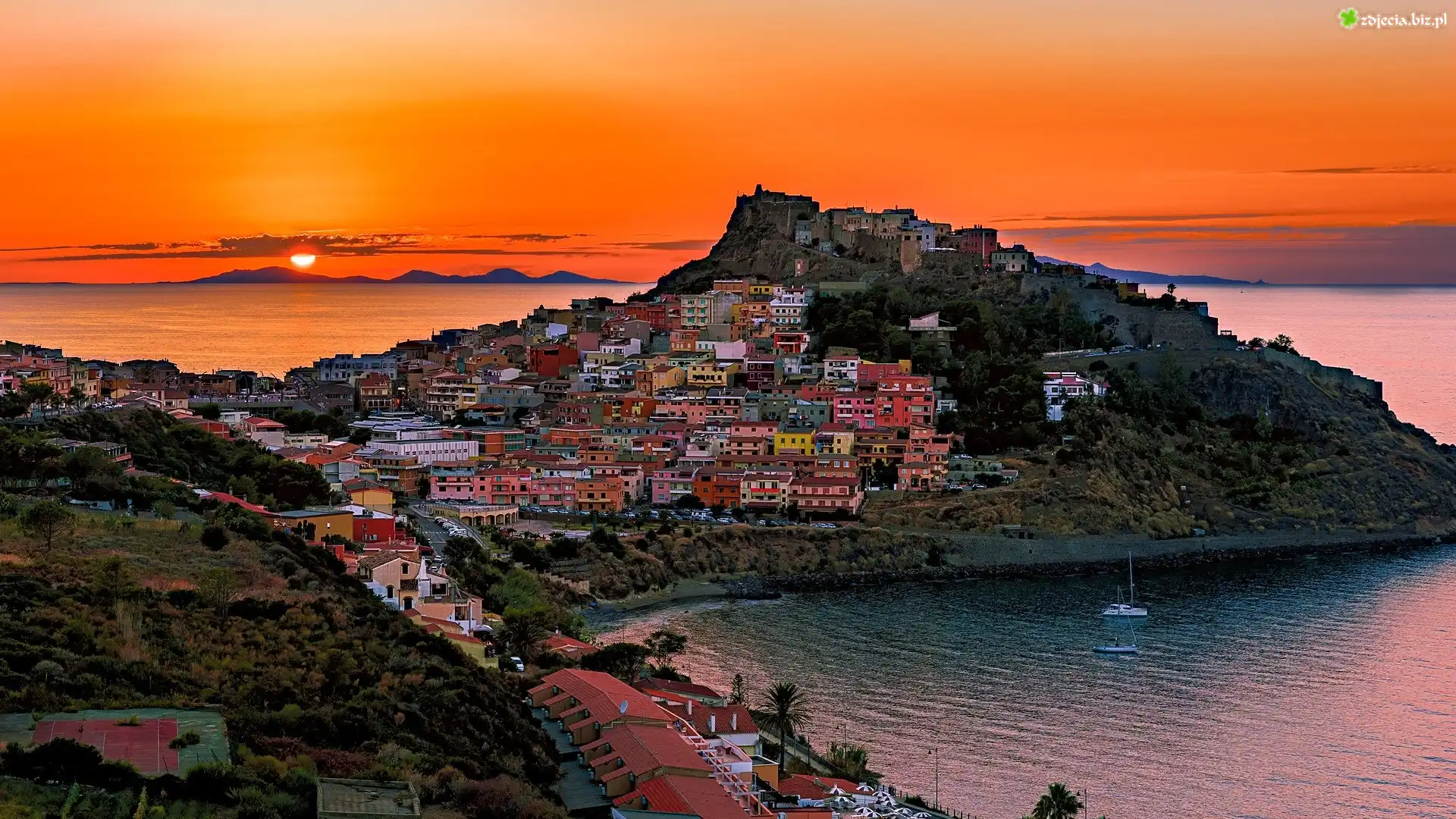 Zdjęcie Zachód słońca, Morze, Domy, Castelsardo, Sardynia, Włochy