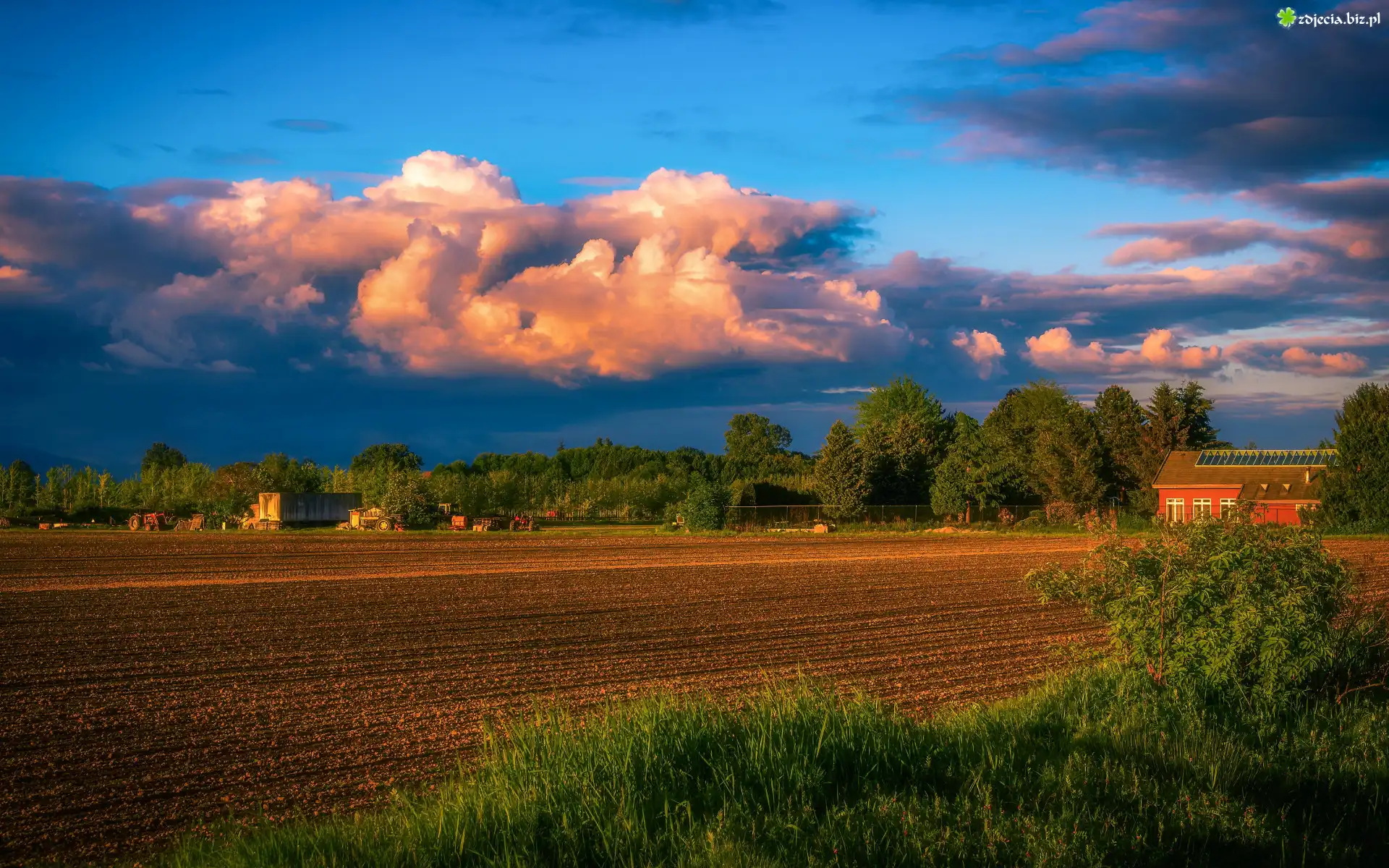 Zdjęcie Domy, Pole, Drzewa, Niebo, Chmury