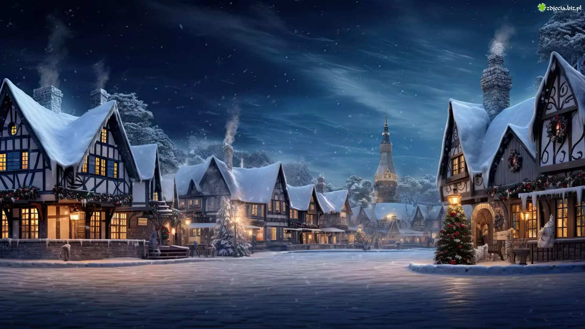 Zdjęcie Zima, Domy, Oświetlone, Choinki, Grafika