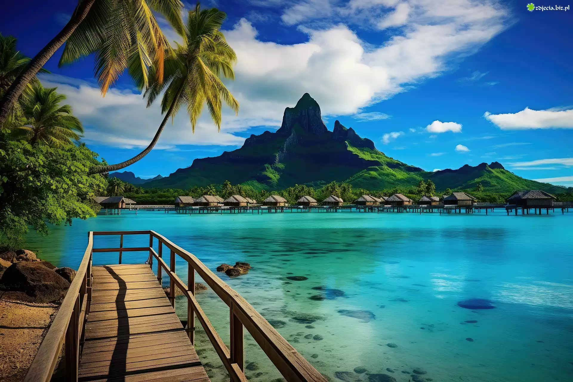 Zdjęcie Morze, Pomost, Palmy, Domy, Bungalowy, Góry, Grafika