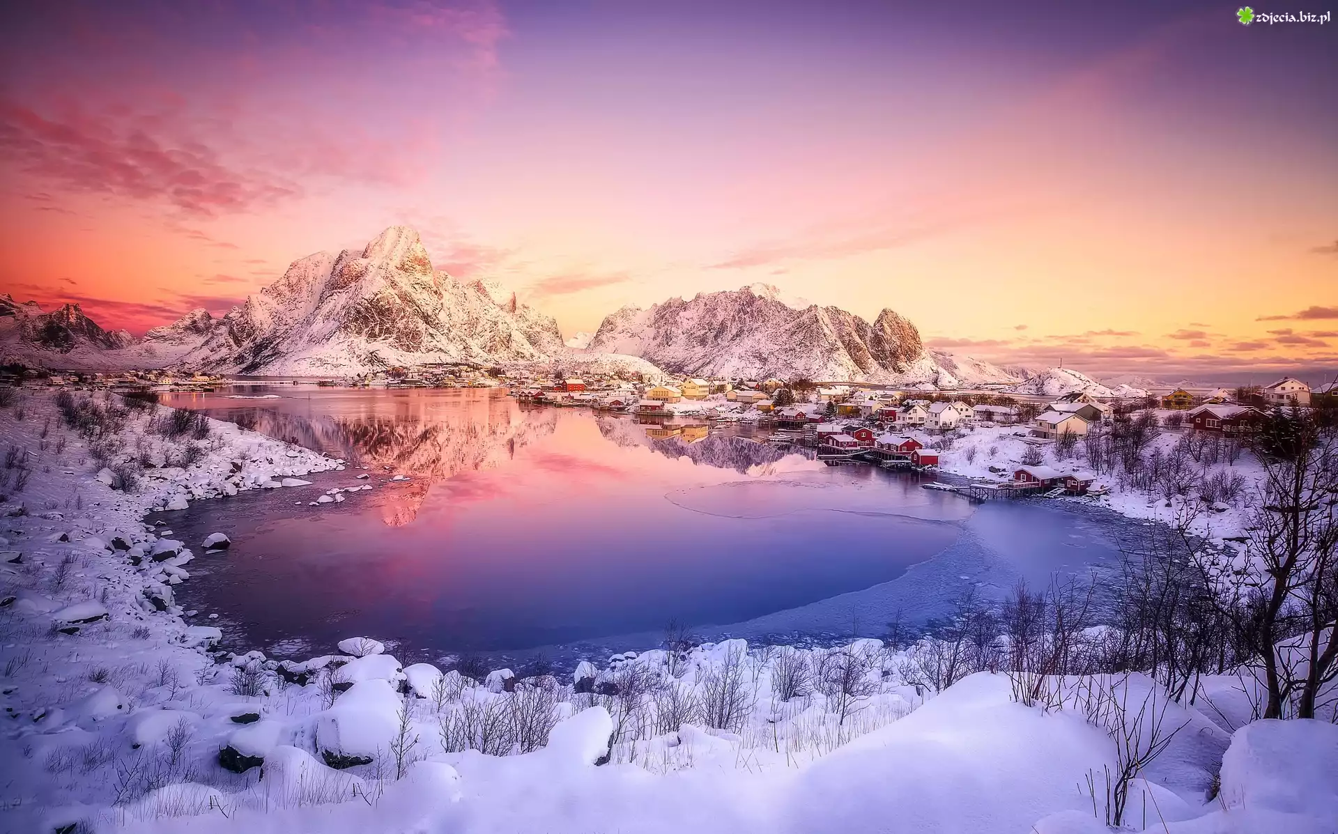 Zdjęcie Norwegia, Wioska Reine, Lofoty, Zima, Góry, Zatoka, Skały, Domy