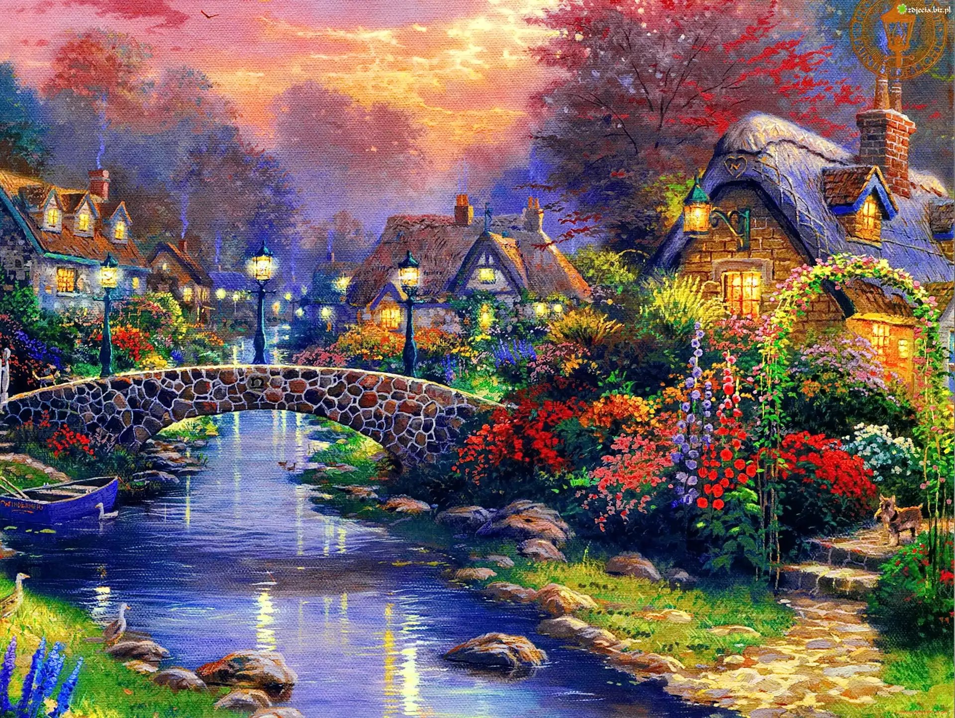 Zdjęcie Domy, Most, Rzeka, Kwiaty