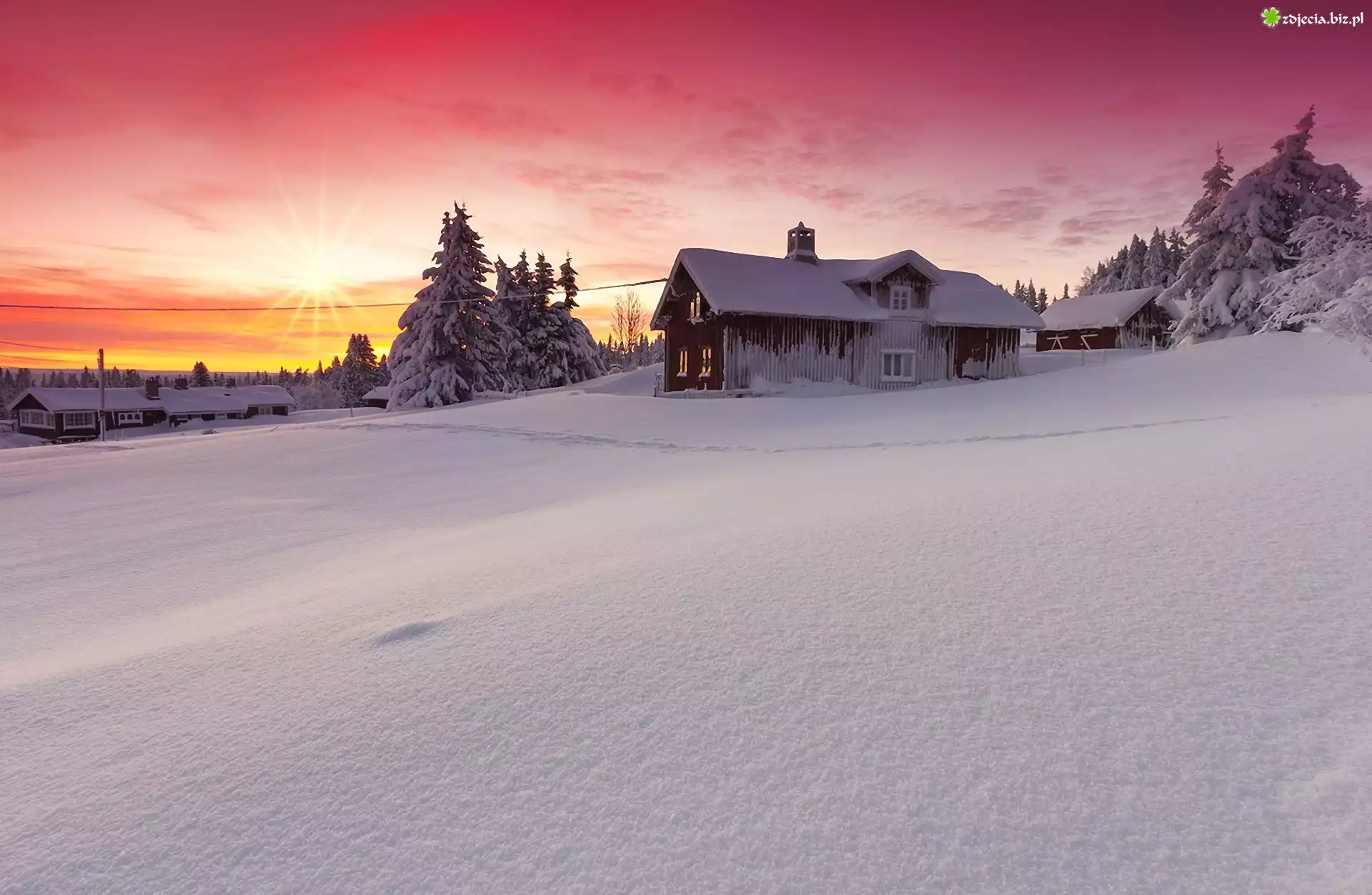 Zdjęcie Domy, Drzewa, Zachód Słońca, Zima