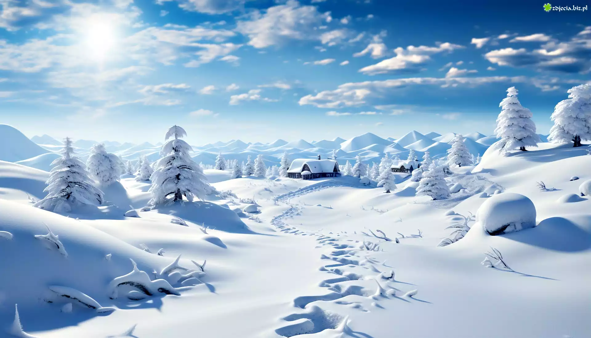 Zdjęcie Zima, Ślady, Śnieg, Domy, Poranek, Słońce, Grafika
