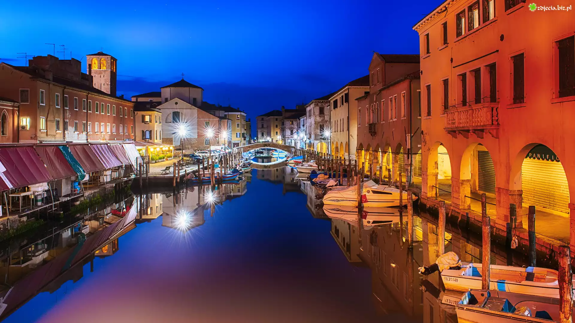 Zdjęcie Noc, Domy, Kanał, Most, Łódki, Chioggia, Wenecja, Włochy