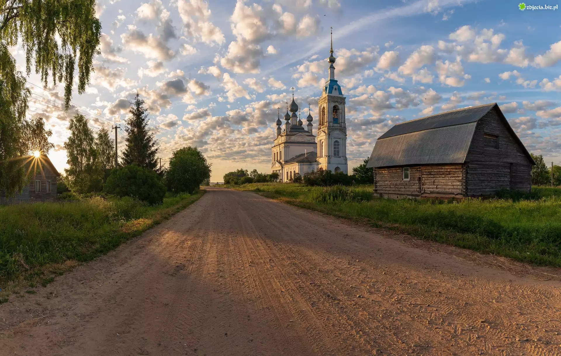 Zdjęcie Droga, Drewniane, Domy, Chmury, Wschód słońca, Cerkiew, Savinskoye, Obwód jarosławski, Rosja |