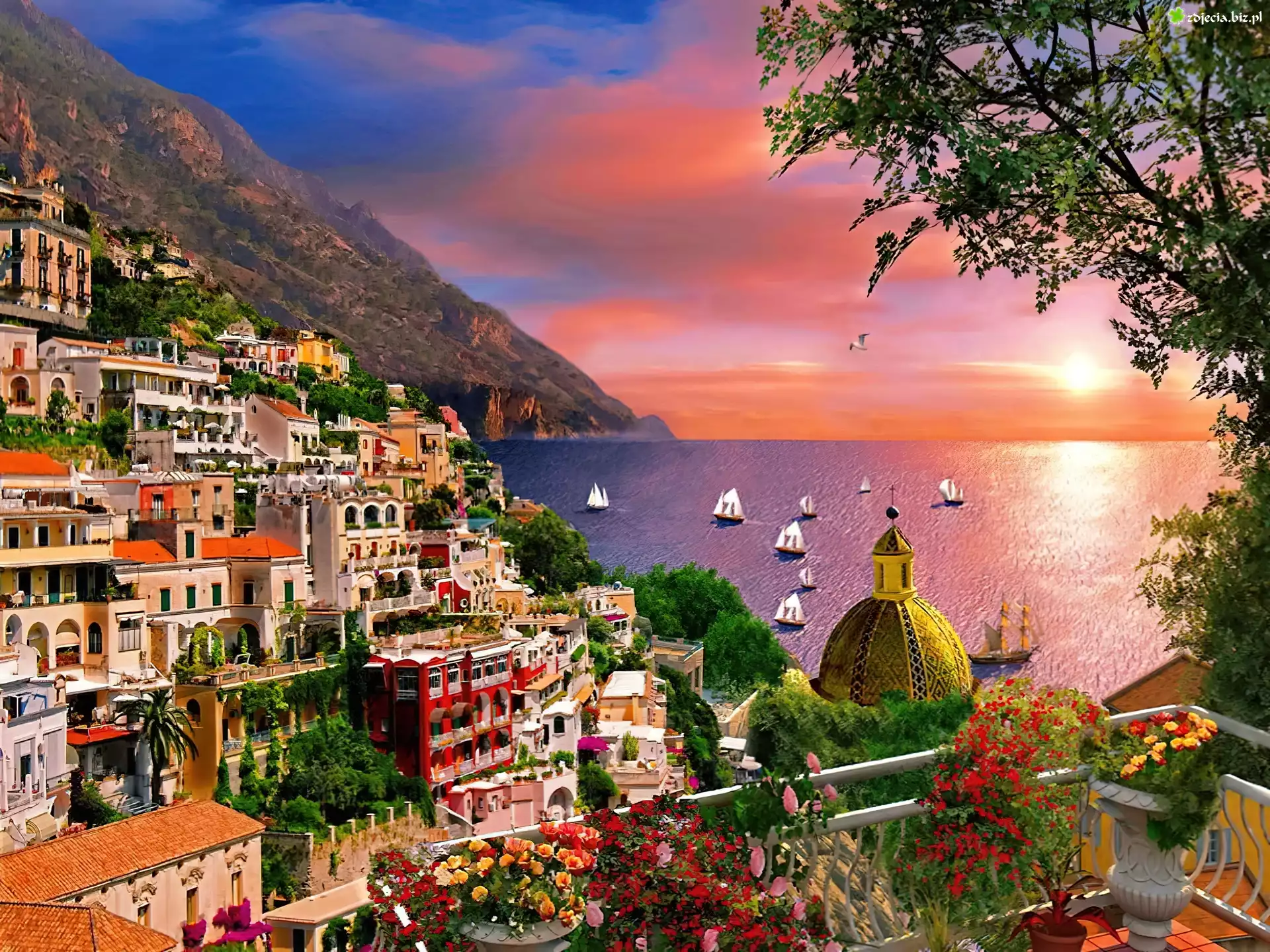 Zdjęcie Domy, Morze, Góra, Zachód, Słońca