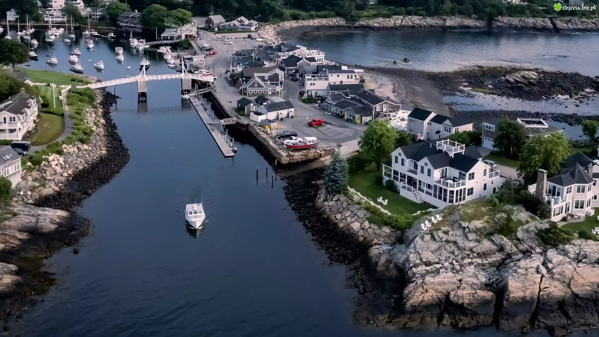 Zdjęcie Stany Zjednoczone, Maine, Ogunquit, Rzeka Ogunquit, Wybrzeże, Domy, Drzewa, Przystań, Żaglówki, Zatoka, Z lotu ptaka |