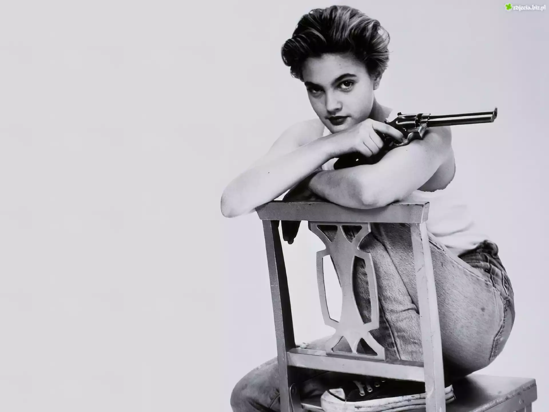 Zdjęcie, Drew Barrymore, pistolet, krzesło, trampki