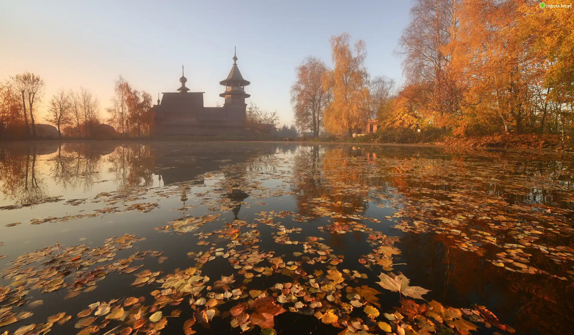 Zdjęcie Jesień, Drzewa, Drewniana, Kaplica, Trawy, Jezioro Onega, Wyspa Kiży, Karelia, Rosja