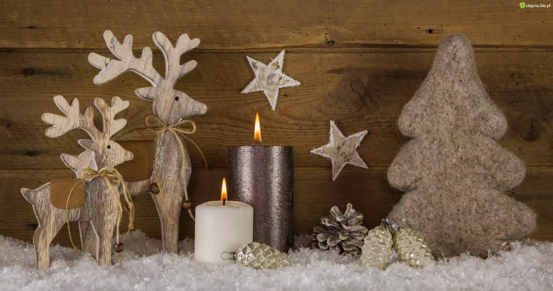 Zdjęcie Kompozycja, Świąteczna, Drewniane, Renifery, Świece, Choinka, Szyszki, Bombki, Śnieg, Boże Narodzenie |
