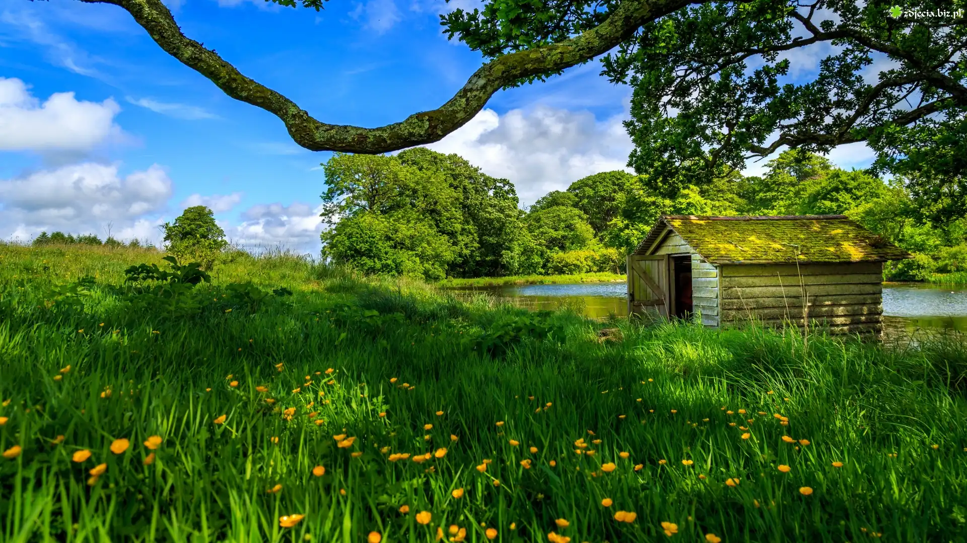 Zdjęcie Drewniany, Domek, Jezioro, Łąka, Kwiaty, Drzewa