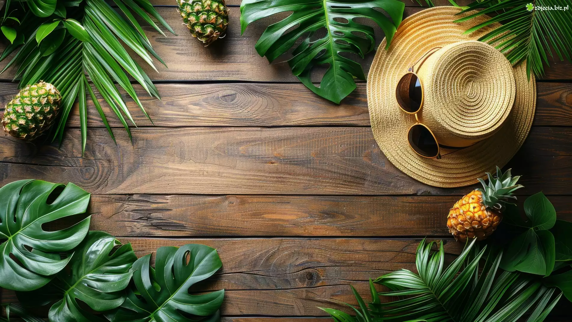 Zdjęcie Kapelusz, Ananas, Liście, Drewno, Deski, Kompozycja