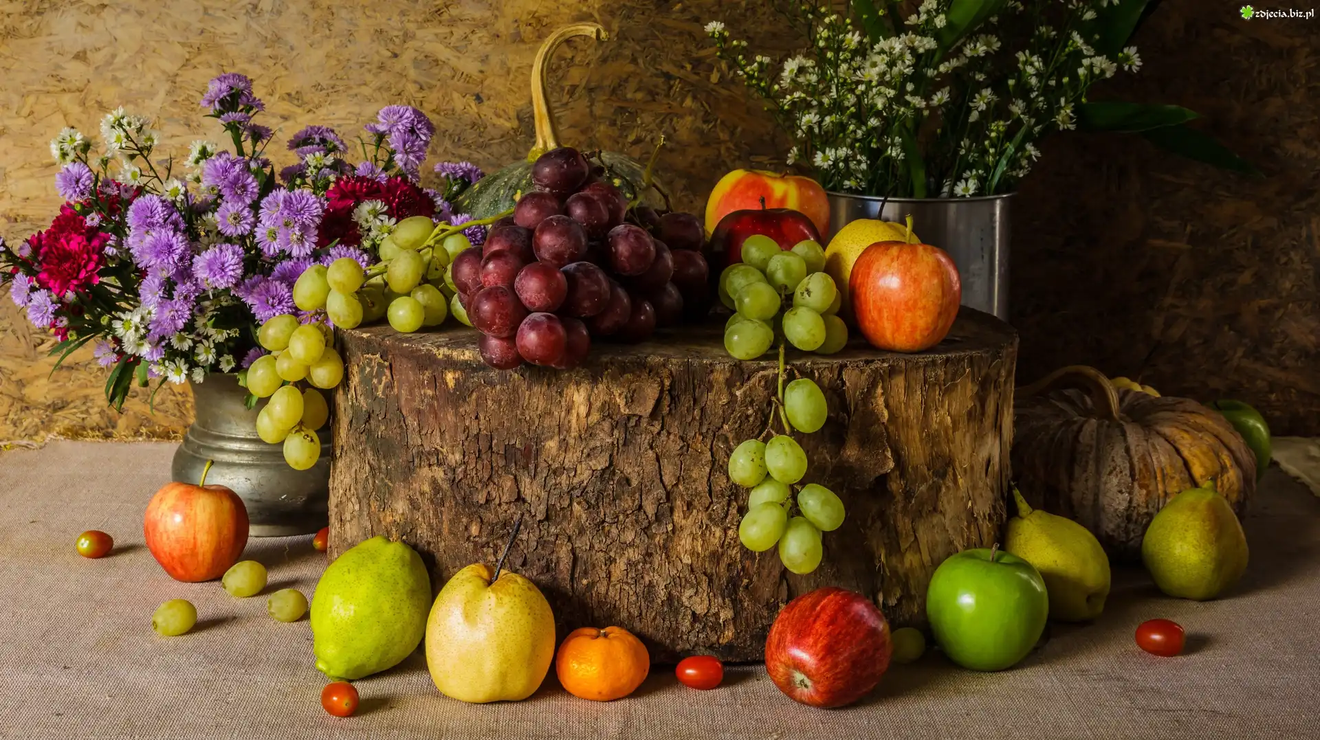 Zdjęcie Astry marcinki, Kwiaty, Wazon, Owoce, Winogrona, Jabłka, Klocek, Drewno