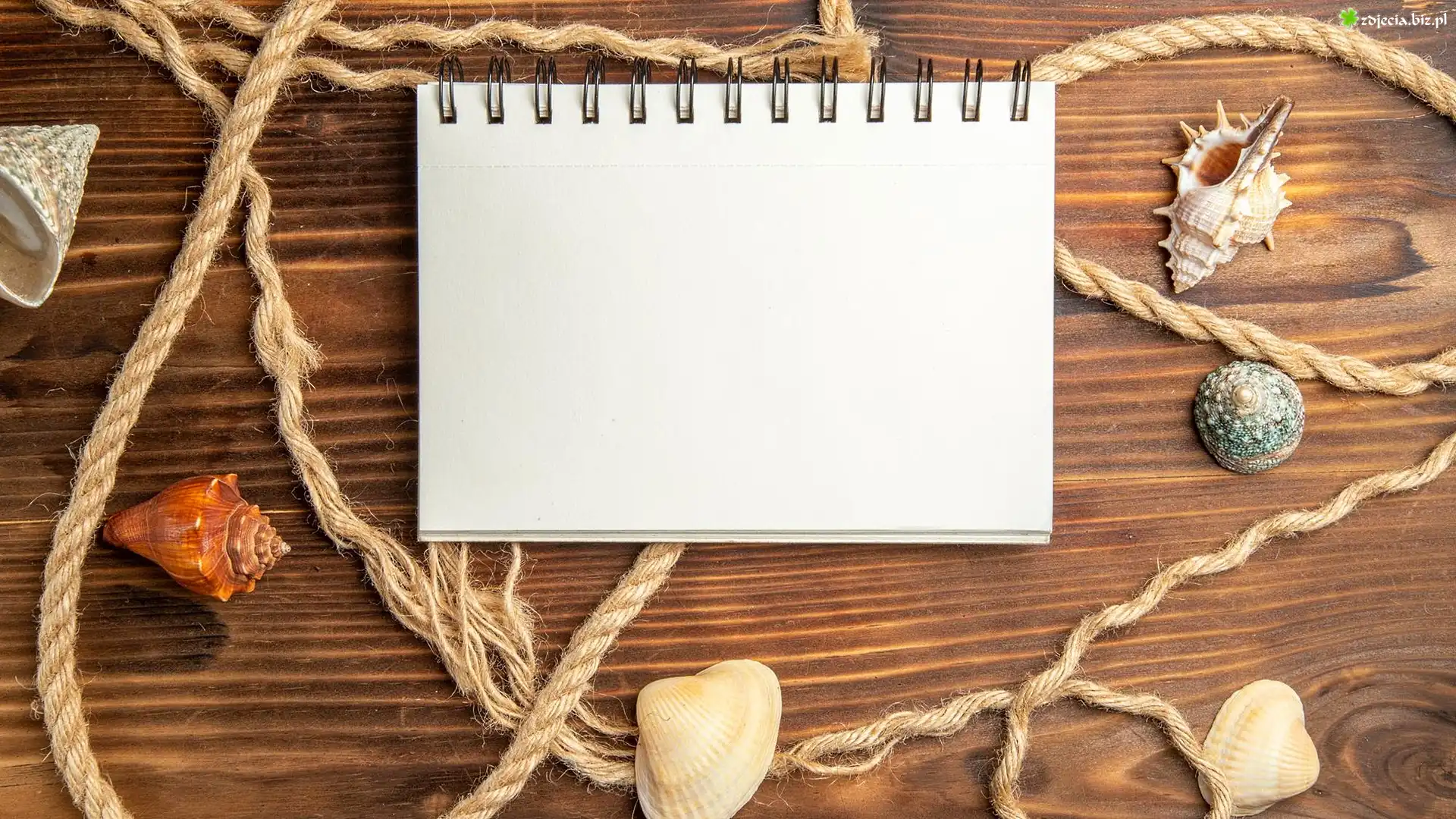Zdjęcie Notatnik, Muszelki, Lina, Drewno