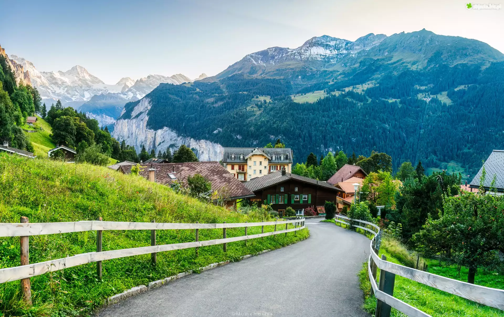 Zdjęcie Szwajcaria, Góry, Alpy Berneńskie, Lasy, Drzewa, Wieś, Wengen, Domy, Droga, Ogrodzenie, Roślinność |