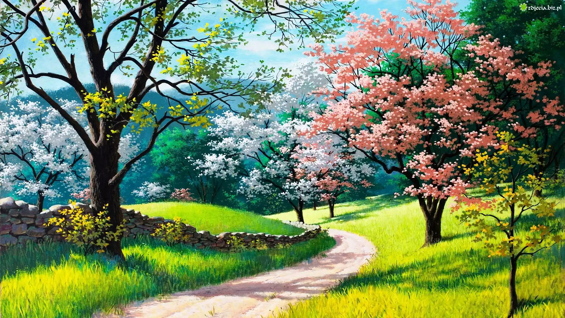 Zdjęcie Droga, Kwitnące, Drzewa, Wiosna