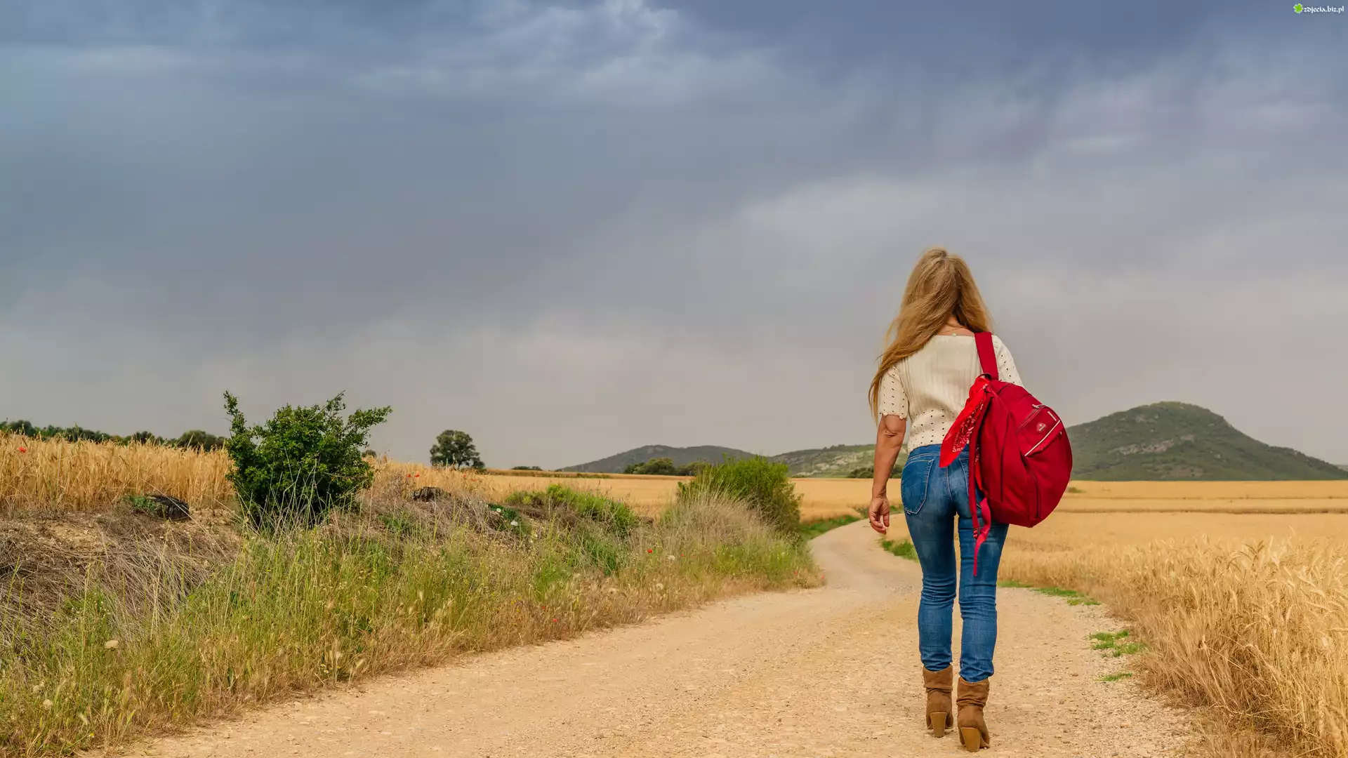 Zdjęcie Droga, Dziewczyna, Plecak, Pola, Drzewa, Góry