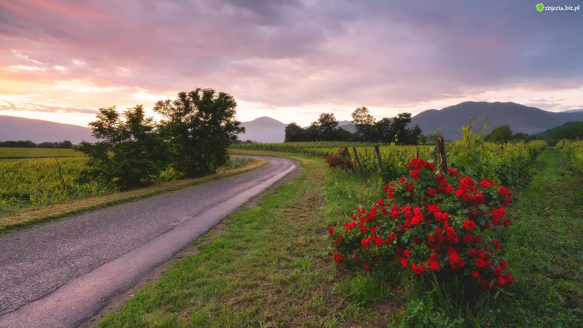 Zdjęcie Góry, Droga, Drzewa, Kwiaty, Róże, Wschód słońca