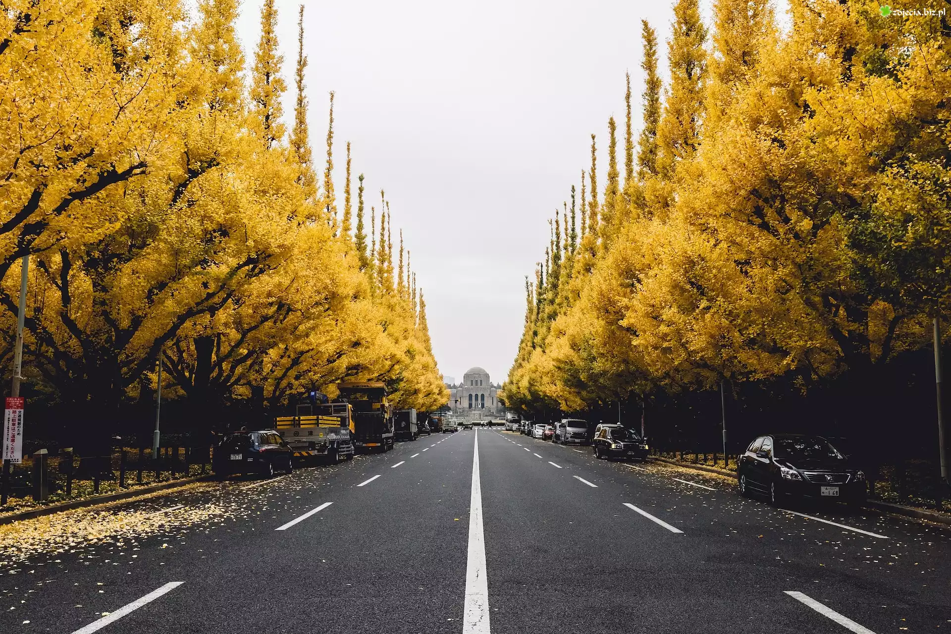 Zdjęcie, Droga, Ulica, Samochody, Jesienne, Drzewa