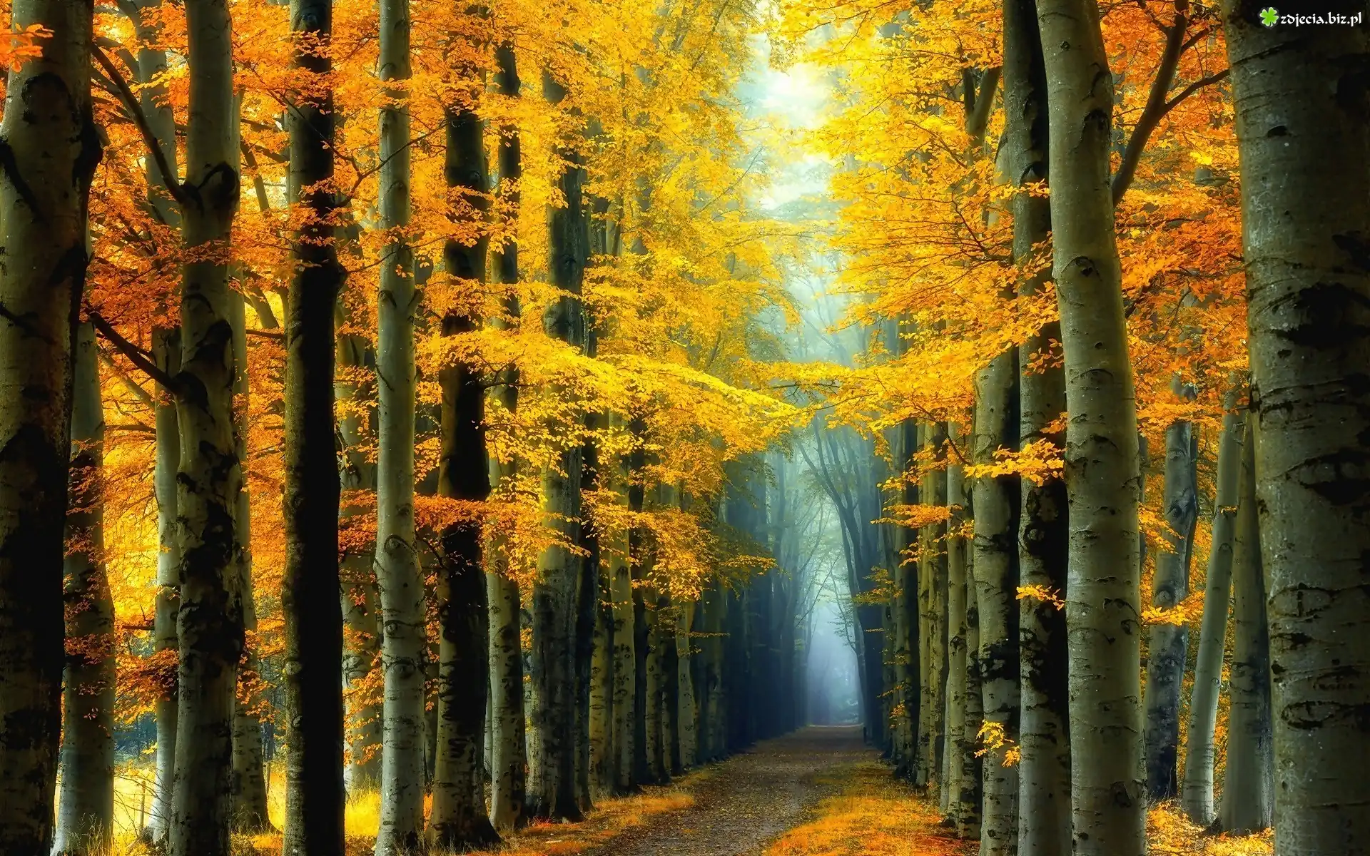 Zdjęcie Las, Droga, Drzewa, Topole osikowe, Mgła, Jesień