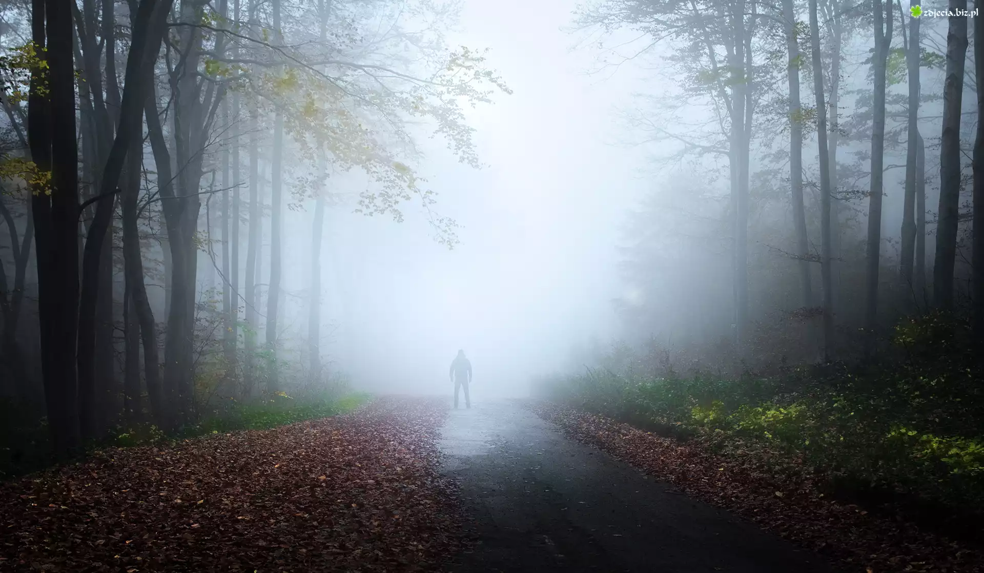 Zdjęcie Droga, Drzewa, Las, Mgła, Człowiek