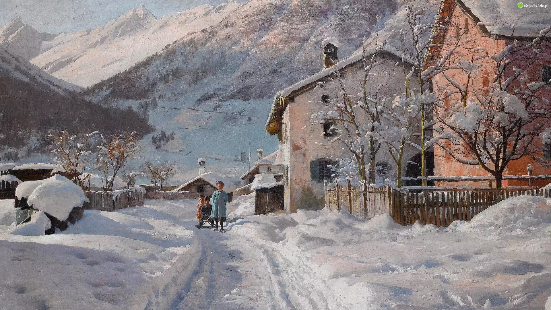 Zdjęcie Malarstwo, Obraz, Zima, Peder Mork Monsted, Dzieci, Sanki, Domy, Droga