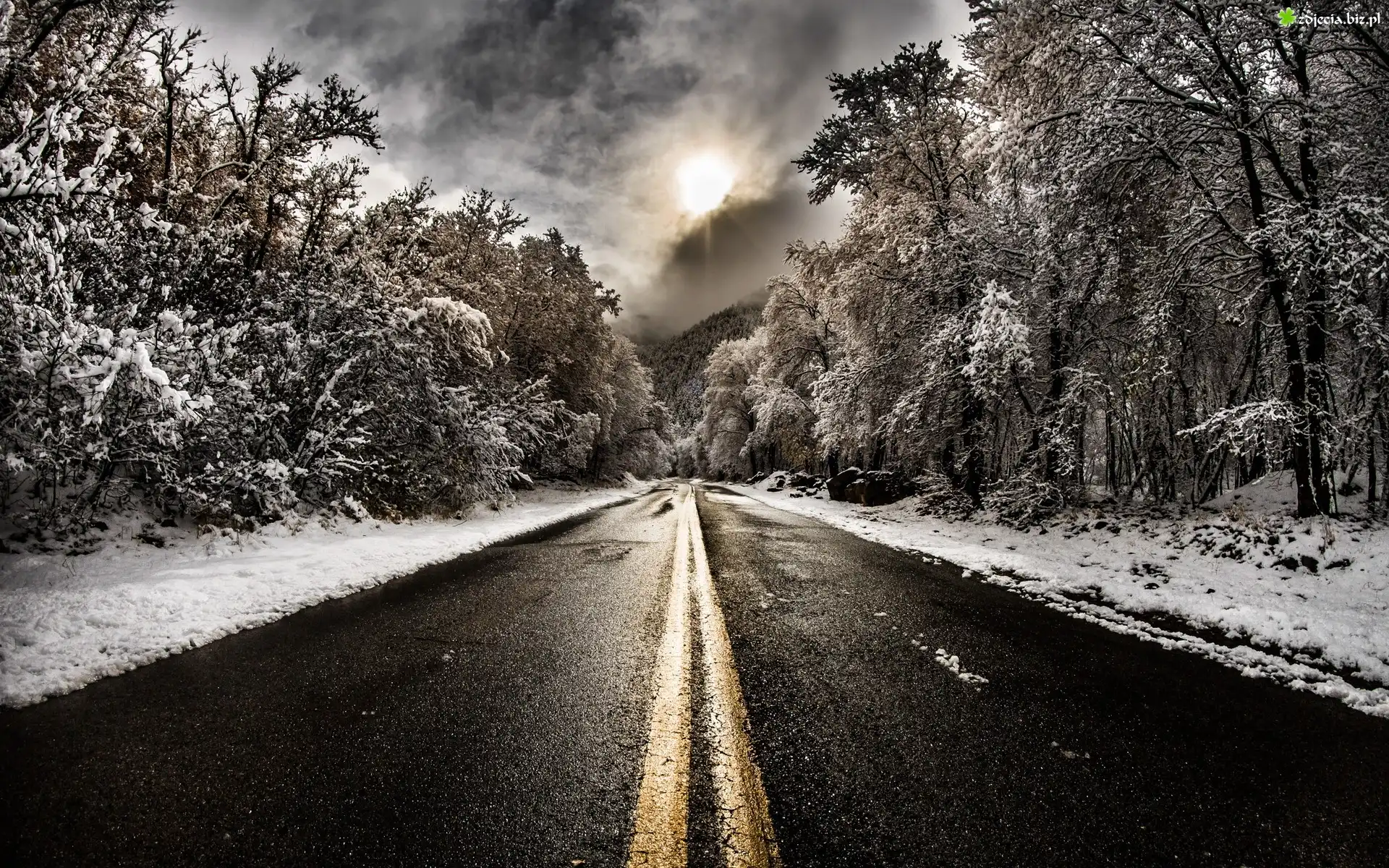 Zdjęcie Droga, Drzewa, Śnieg, Słońce
