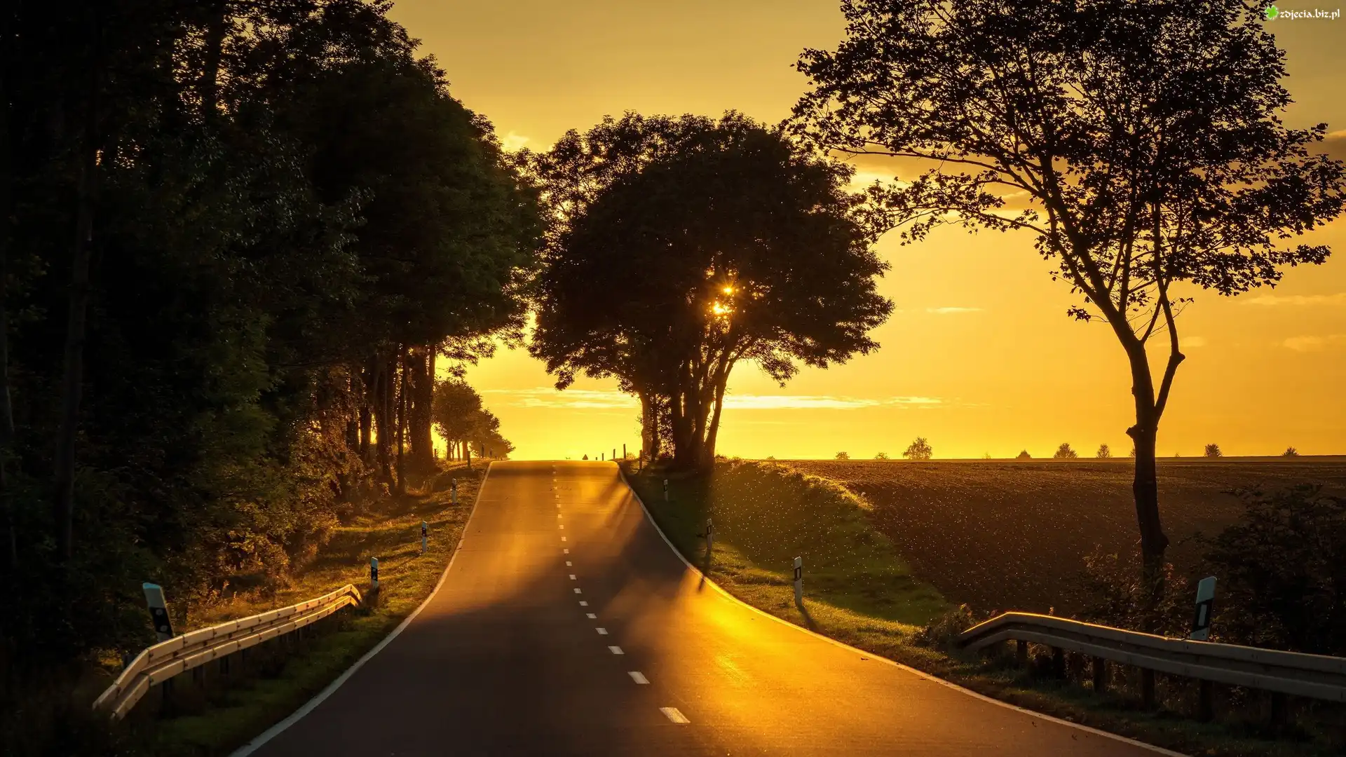 Zdjęcie Droga, Zachód słońca, Drzewa, Pola, Niebo