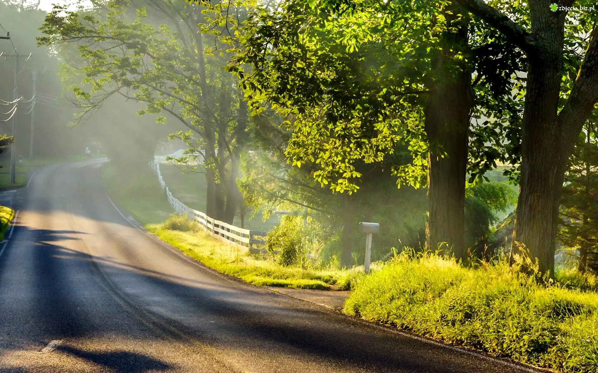 Zdjęcie Droga, Drzewa, Poranek, Mgła