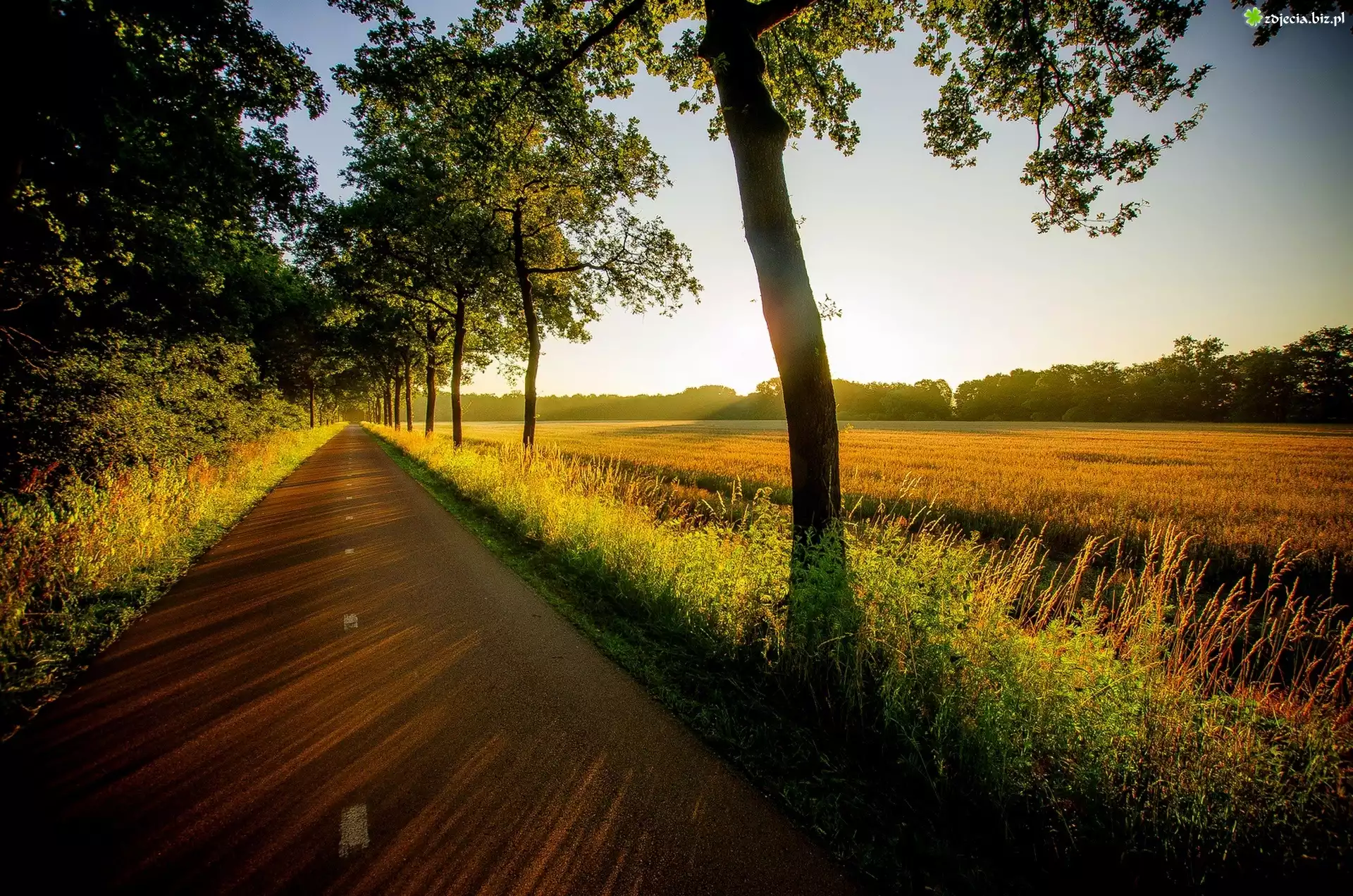 Zdjęcie Droga, Drzewa, Pole, Poranek, Przebijające Światło