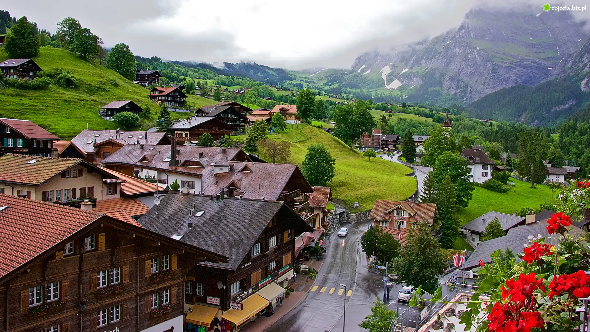 Zdjęcie Domy, Droga, Góry, Miejscowość, Grindelwald, Kanton Berno, Szwajcaria