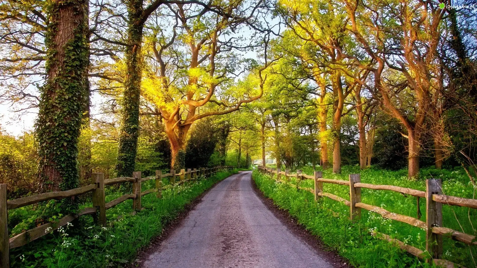 Zdjęcie Droga, Drzewa, Płot, Przebijające, Światło, Wiosna