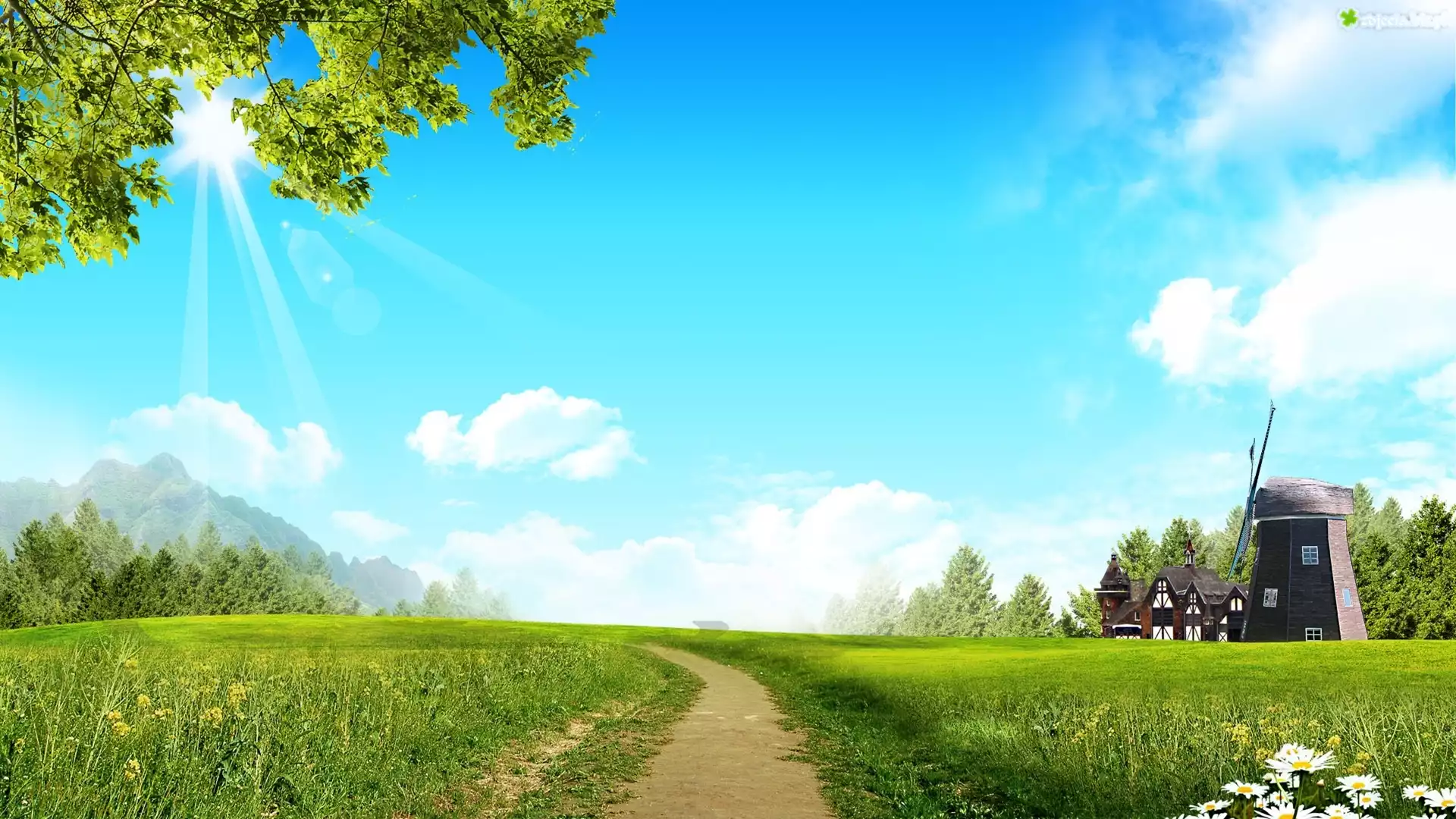 Zdjęcie Droga, Łąka, Wiatrak, Promienie