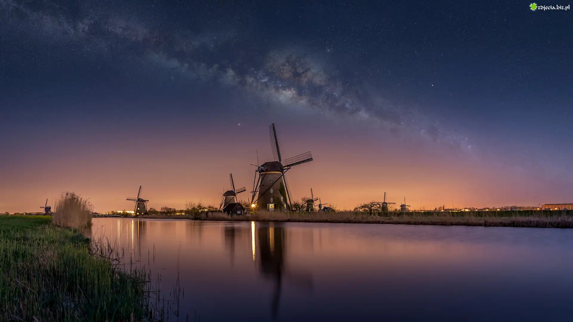 Zdjęcie Droga mleczna, Rzeka, Wiatraki, Gwiazdy