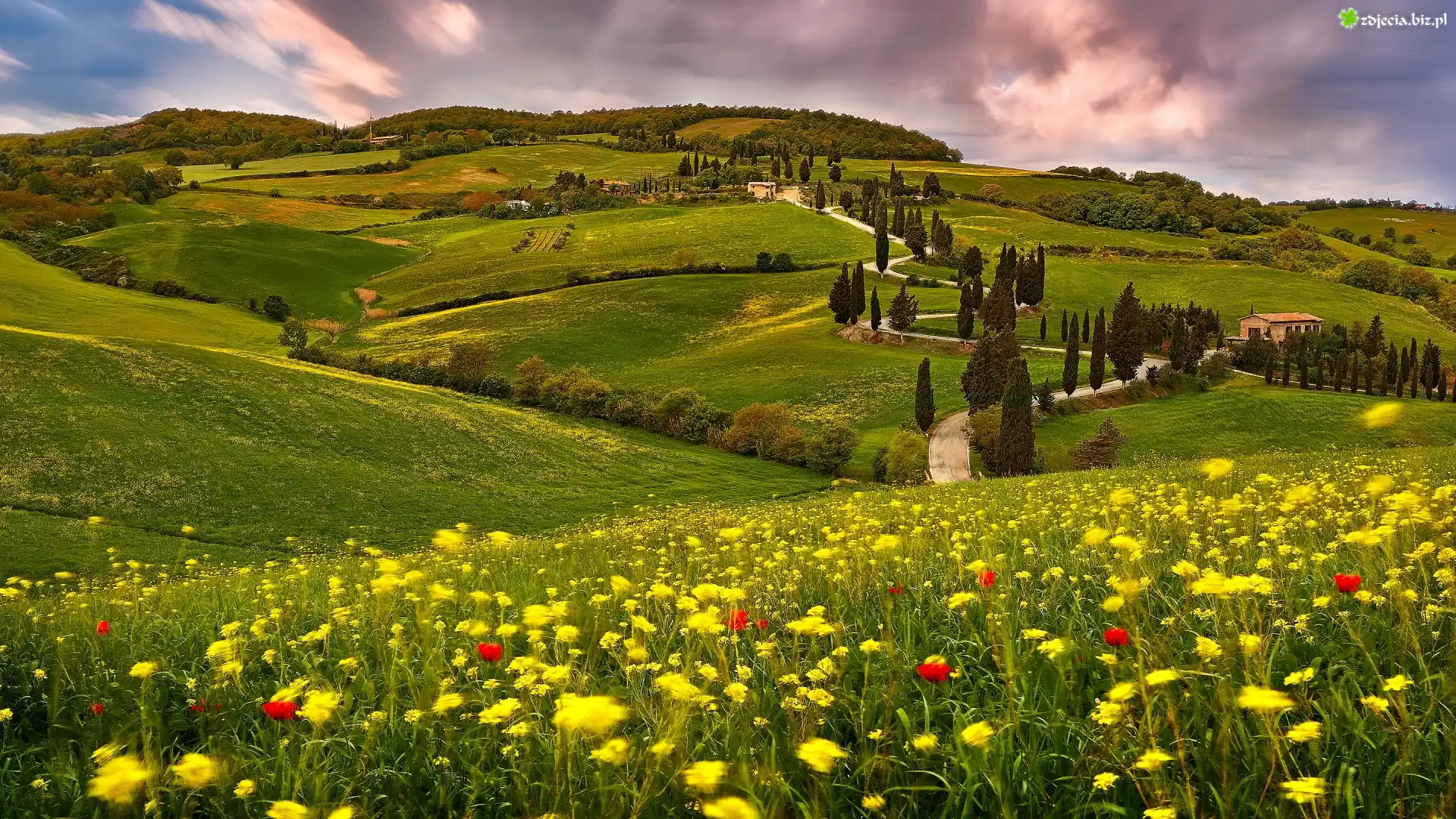 Zdjęcie Wzgórza, Droga, Drzewa, Cyprysy, Łąka, Kwiaty, Toskania, Włochy